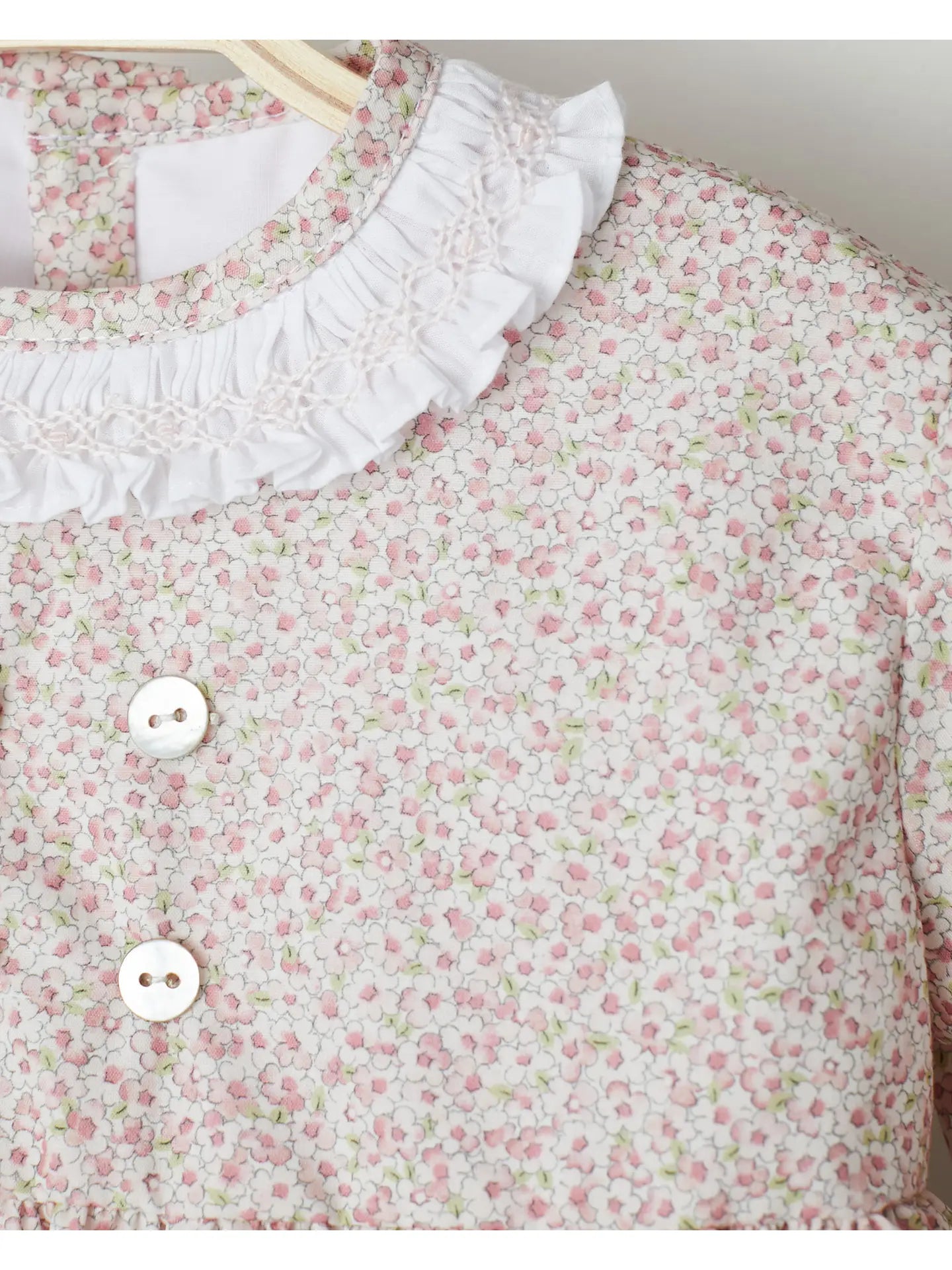 Dress printed in pink flowers with hand-embroidered collar and cuffs in smock stitch, and long sleeves.